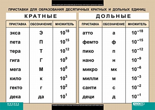 Таблица. Физика. Приставки для образования десятичных кратных и дольных единиц.
