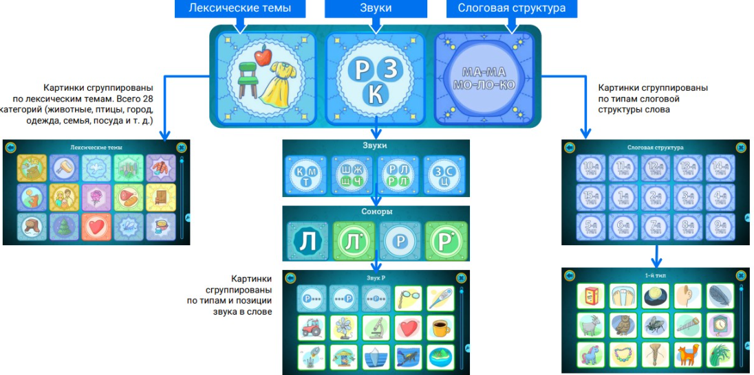 — Более 400 тематических картинок для изучения основных лексических тем, отработки звуков, а также слов разных типов слоговой структуры