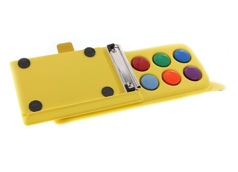 Положите книгу на коммуникатор, закрепите ее. Затем запишите каждую страницу текста, используя для каждой страницы одну из шести встроенных цветных круглых кнопок. Далее пометьте специальной цветной наклейкой каждую страницу в соответствии с цветом той кнопки, которую вы нажимали при записи текста данной страницы. Когда в книге более шести страниц, перейдите на следующий уровень записи. Чтобы прослушать рассказ, ребенку нужно нажать клавишу того цвета, которым отмечена данная страница книги. Сменные наклейки прилагаются.