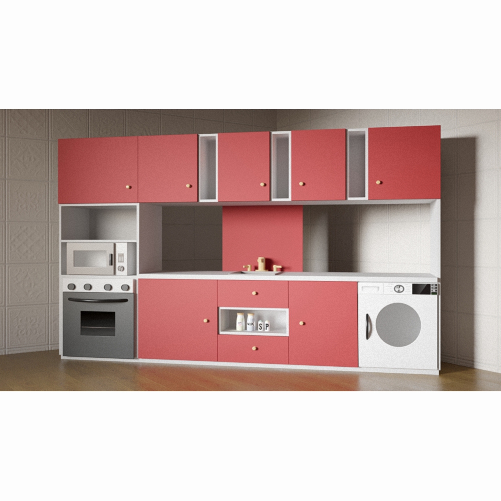 Многочисленные закрытые шкафчики помогут разместить все необходимое для приготовления пищи, а стиральная машина, духовой шкаф, СВЧ-печь и рукомойник со смесителем поможет сделать игру разнообразнее, развивая детское воображение и навыки самообслуживания.