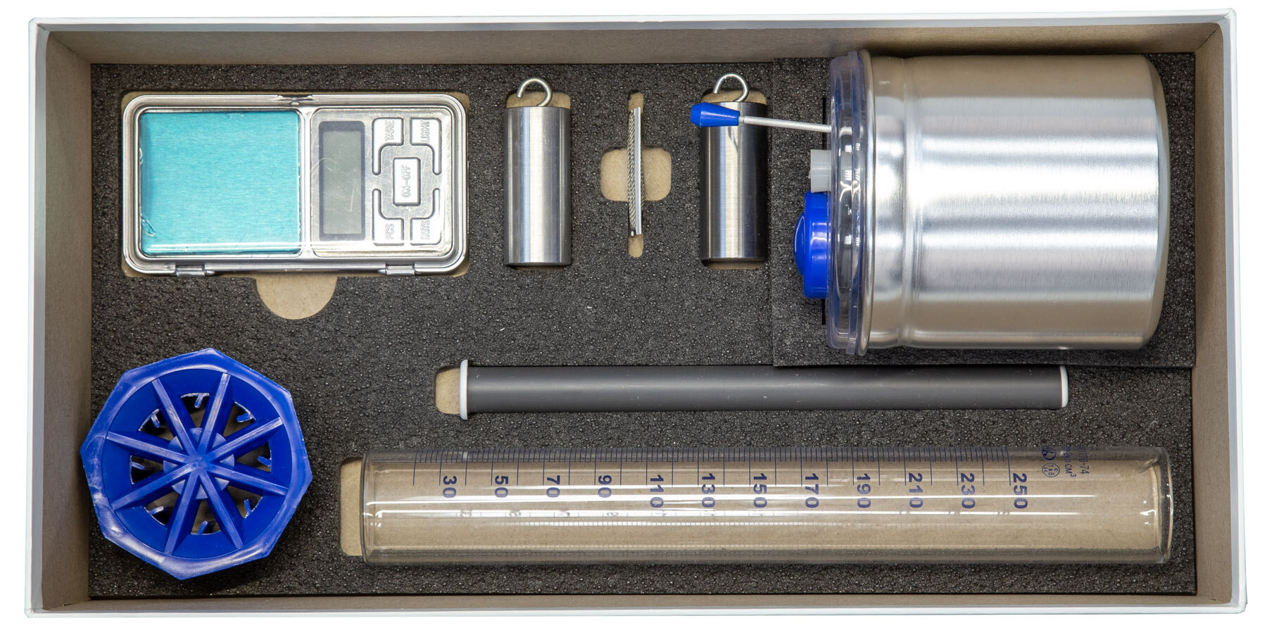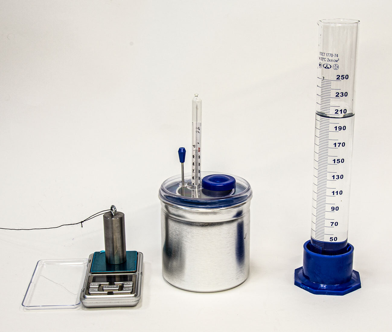 Комплект позволяет измерить удельную теплоёмкость металлического цилиндра, количество теплоты, полученное водой комнатной температуры и отданное нагретым цилиндром, исследование изменения температуры воды при различных условиях.