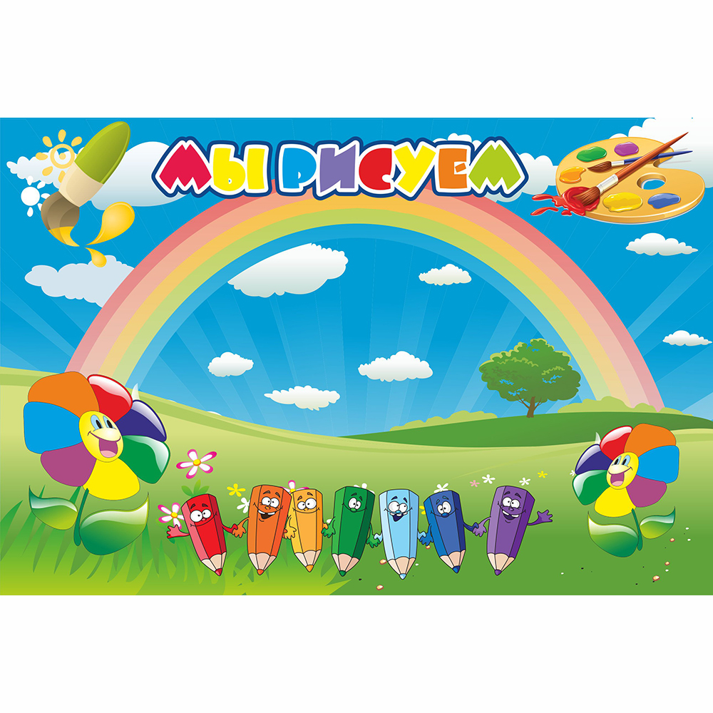 Магнитный стенд для рисунков является не только практичным инструментом, но и отличным средством для развития творческого потенциала детей. Этот вариант стенда "Мы рисуем" представляет сразу пара Цветиков-семицветиков. Яркая радуга и легкие плывущие облака в залитом солнечными лучами небе, развесёлая компания карандашей всех цветов радуги на лужайке, а также разноцветные буквы названия стенда создают радостное творческое настроения детям, а удобное крепление на магниты позволит без проблем разместить рисунки в любом месте стенда.