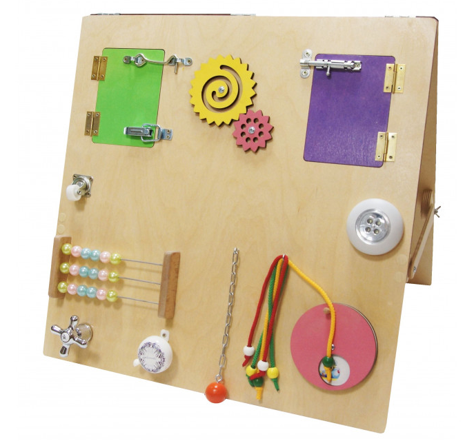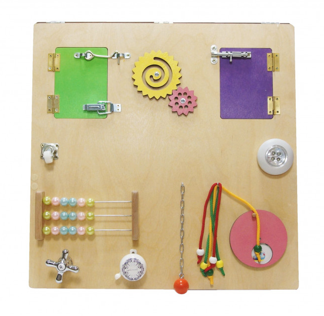 Бизиборд №1 обладает всем необходимым для разностороннего развития ребенка. Удобные дверцы с защелками и шестеренки позволяют развивать мелкую моторику и учить малышей считать. Бусины на шнурках тренируют пальцы и помогают осваивать навыки сопоставления цветов. Все эти элементы не только увлекательны, но и безопасны для малышей благодаря возможности надежного крепления к стене.