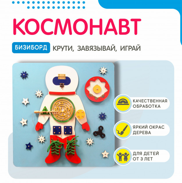 - Фантазия и воображение: форма космонавта и разнообразные игровые элементы на бизиборде стимулируют фантазию и воображение детей, позволяя им создавать свои собственные игровые сценарии и истории.