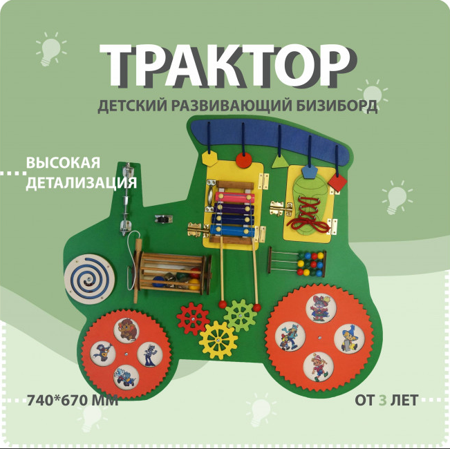 Настенная панель в виде трактора – яркий, красочный игровой элемент с дидактической ценностью. Многофункциональна и компактна. Представляет из себя фигурную деревянную доску в форме трактора, оснащённую разнообразными яркими элементами для приобретения детьми дошкольного возраста полезных навыков в формате игры.