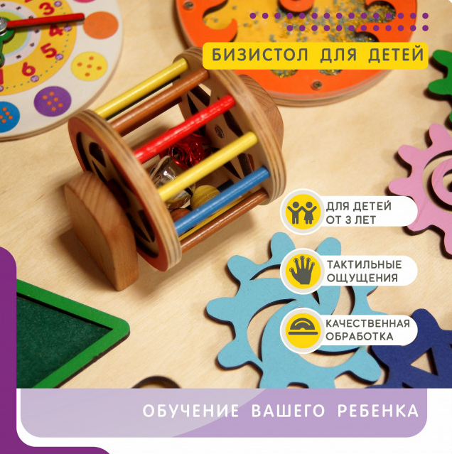 На бизистоле представлены разнообразные игровые элементы, такие как шестеренки, объемное колесо с элементами, часы, цифры, тактильные области, руль, счеты, круг с прозрачной передней стенкой и сыпучим содержимым, тактильный лабиринт. Эти элементы развивают моторику рук, координацию движений, логику и воображение. Малыши смогут собирать, крутить и отслеживать перемещение различных частей, что способствует развитию их наблюдательности и познавательных способностей.
