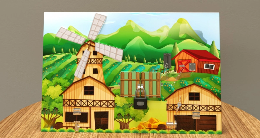 Играя с дверным замком, ключом, цепочкой и защёлками, ребёнок приобретает необходимые полезные социально-бытовые навыки. Открывание и закрывание дверок стимулирует развитие мелкой моторики пальцев. Также на примере ярких и красочных картинок можно познакомить ребёнка с понятиями деревня и сельское хозяйство.