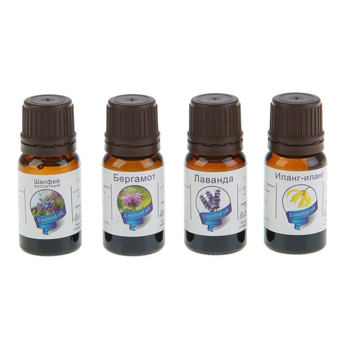 Эфирные масла лаванды, бергамота, иланг-иланга, шалфея, расфасованные по 10 мл, сопровождающиеся аннотациями.