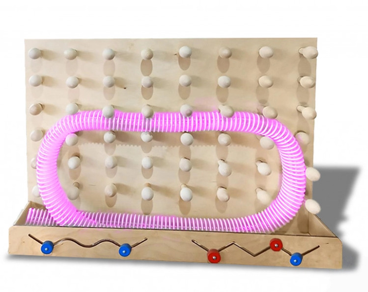 • Подвижный круг можно перемещать по траектории в одну сторону, а затем в другую. Множество выпуклостей, расположенных на панели на равном расстоянии, создают препятствия. Гибкую трубку можно укладывать между ними, придумывая разные фигурки.