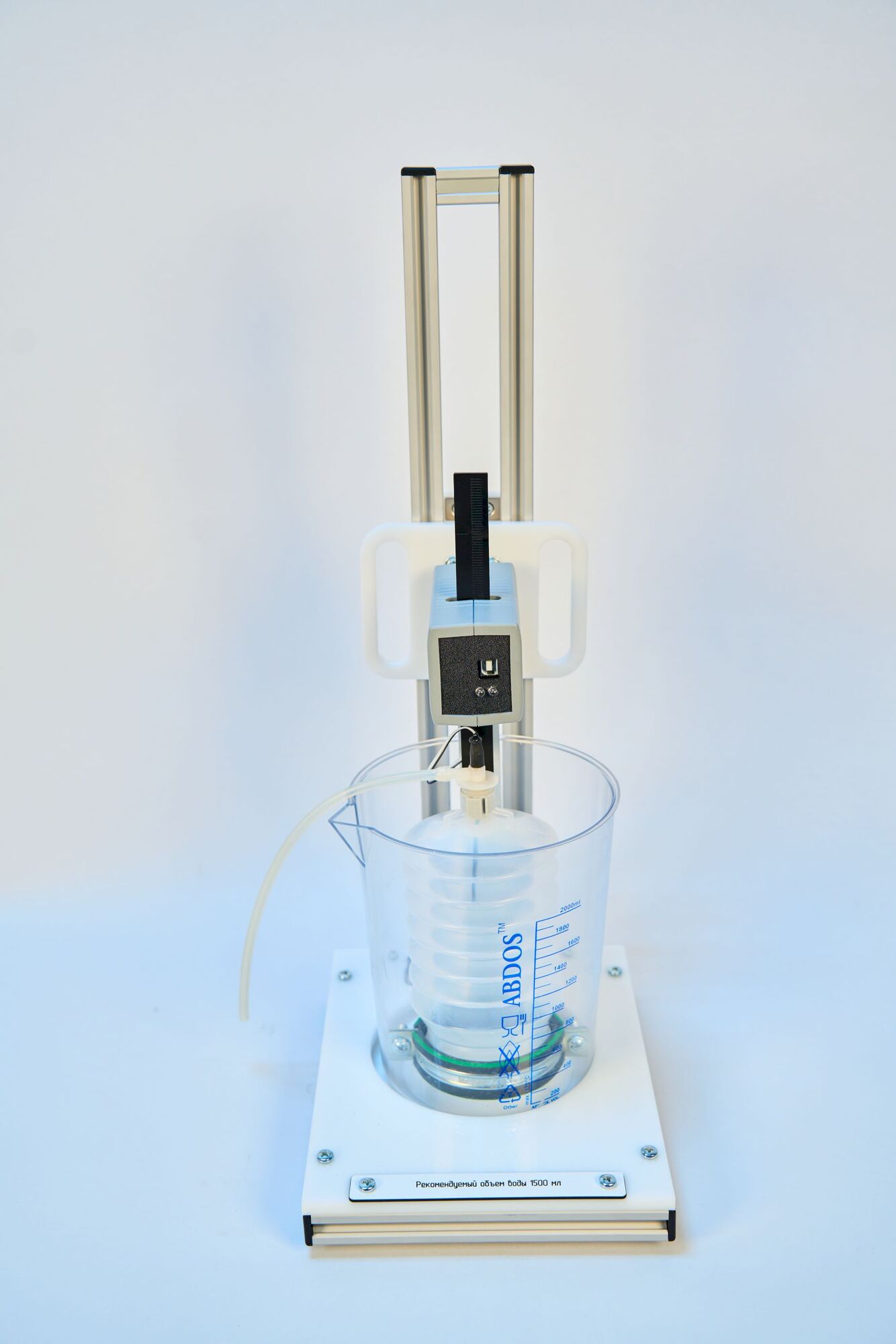 Лабораторная установка представляет собой герметичный резервуар, который смонтирован на вертикальной стойке таким образом, чтобы он мог быть погружен в резервуар с горячей или холодной водой. Герметичный резервуар имеет гофрированную боковую поверхность, обеспечивающую постоянство давления внутри резервуара за счет изменения его длины. Одно из оснований герметичного резервуара жестко связано с подвижным элементом датчика объема. Электронная схема датчика объема и датчика температуры смонтирована в едином корпусе. Датчик температуры обеспечивает измерение температуры газа, который находится в резервуаре. Квазистационарные условия изобарного процесса обеспечиваются при остывании предварительно нагретого резервуара на воздухе. Нагрев резервуара и, соответственно, находящегося в нем воздуха осуществляется при погружении его в горячую воду.