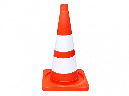 Сигнальный дорожный конус представляет собой техническое средство организации дорожного движения в форме конуса оранжевого цвета с площадкой у основания и двумя белыми полосами.