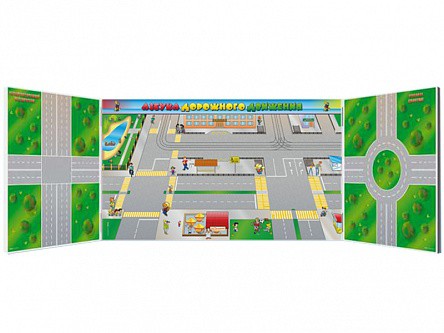 Панорамная трехэлементная комбинированная магнитно-маркерная доска представляет собой информационную панель, на которой изображена демонстрационная схема дорожного движения участка города, включая проезжую часть, трамвайные пути, перекрестки, пешеходные переходы, остановочные площадки, объекты социальной инфраструктуры, для моделирования дорожных ситуаций с помощью магнитов и цветных маркеров. Магнитно-маркерная доска предназначена для ознакомления детей дошкольного и школьного возраста с правилами безопасного поведения на дорогах и в пределах жилой зоны, закрепления знаний об элементах дороги, развития внимания и умения оценивать действия пешеходов. Двухсторонние разворотные секции доски демонстрируют особенности четырехстороннего перекрестка и кругового движения, что позволяет глубоко изучать наиболее проблемные дорожные ситуации. Обратная сторона разворотных секций белого цвета, что позволяет использовать их в качестве экрана для видеопроектора.