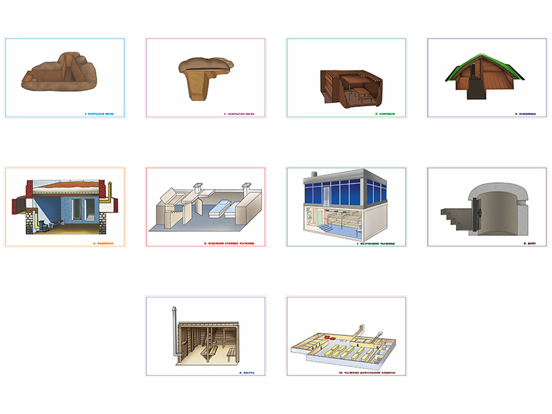 Магнитно-маркерная доска представляет собой настенную наглядно-демонстрационную панель, на которой размещены контурные изображения макетов убежищ и простейших укрытий в разрезе и с разных сторон. Также на панели имеется поле для ведения записей и пометок.