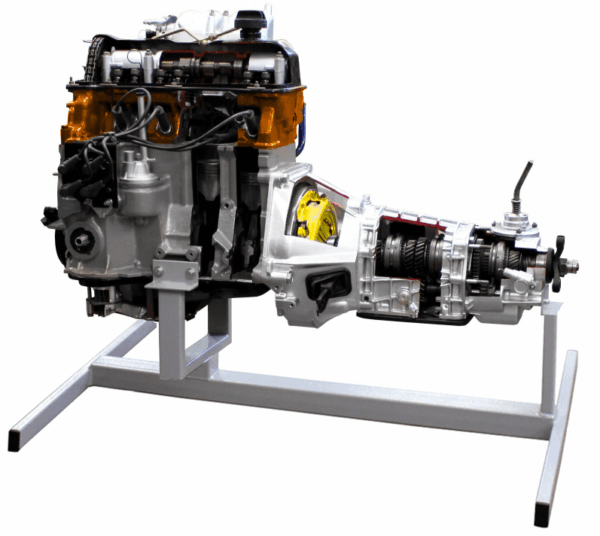 Отдельные элементы, входящие в состав агрегата (ДВС, механизм сцепления и КПП) полностью или частично разрезаны для обеспечения наглядности и понимания особенностей их конструкции.