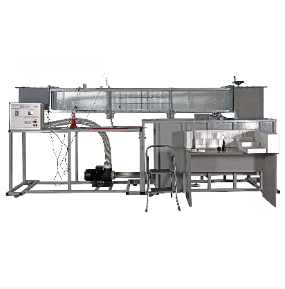 Проточная часть является основным элементам для проведения лабораторных работ. Проток представляет собой, сварную конструкцию из стали, с прозрачными вставками из акрилового материала, с механизмом качения и опорой для домкрата, также в конструкции имеются фланцы для присоединения напорного и сточного баков. В боковых частях протока, имеется механизм фиксации предназначенный для установки различных видов водосливов, разделителей и порогов. На выходе проточной части установлена механическая задвижка, изменение положения производятся при помощи рукоятки. Изменение угла наклона проточной части производится с помощью подъемного механизма. Измерение скорости потока осуществляется трубкой Пито.