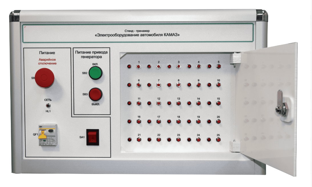 На панели управления размещён блок ввода неисправностей, позволяющий имитировать 25 неисправностей электрооборудования автомобиля КамАЗ.