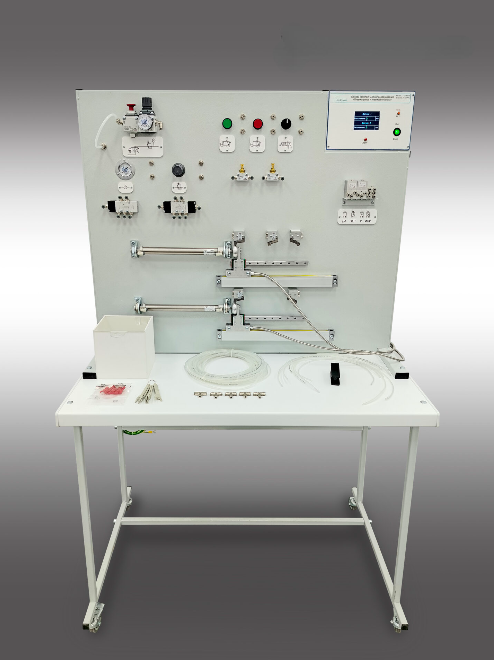 Учебный комплект рассчитан на обучение основам управления пневмоприводами. Элементы пневмоавтоматики жестко закреплены на центральной панели комплекса с целью сокращения времени на монтаж, сохранности элементов и защиты от вандализма. Демонтаж элементов осуществляется только при разборке стенда.