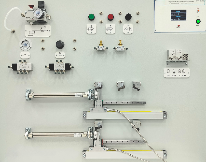 Учебный комплект для решения задач согласованного управления двумя пневматическими приводами.