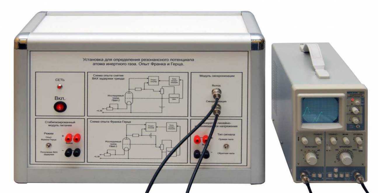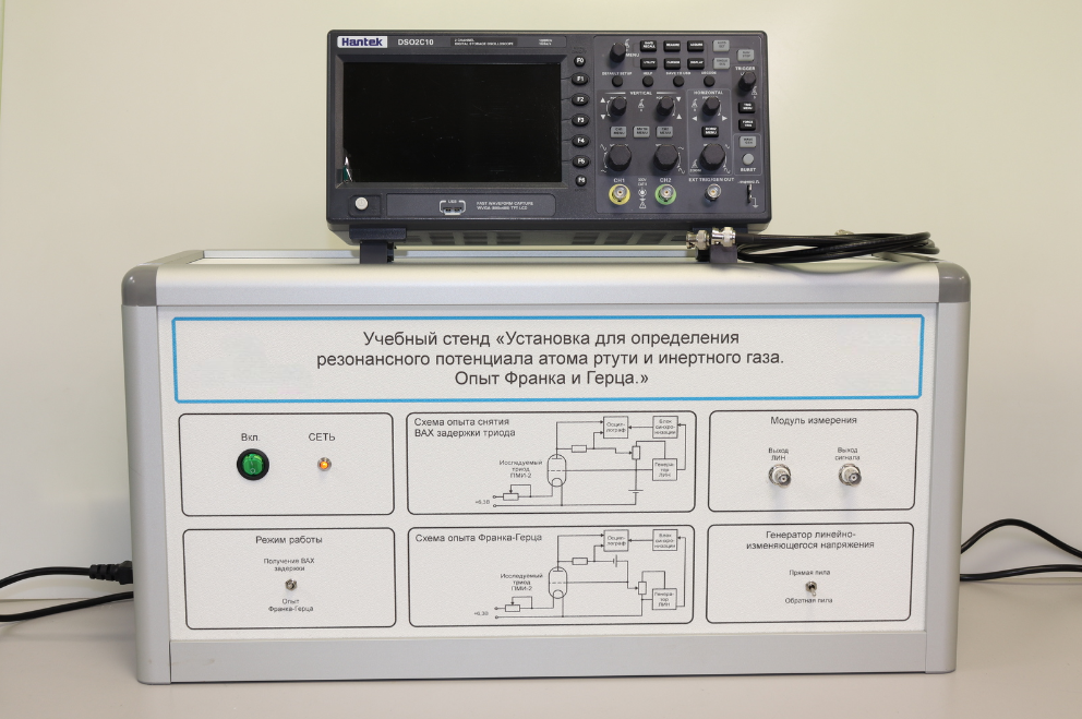Учебный стенд «Установка для определения резонансного потенциала атома инертного газа. Опыт Франка и Герца» предназначен для проведения лабораторных работ по определению резонансного потенциала атома ртути и инертного газа.