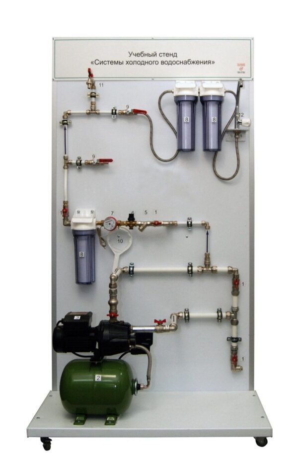 Стенд позволяет рассмотреть монтаж системы холодного водоснабжения. Обозначения направления жидкости на всех узлах стенда