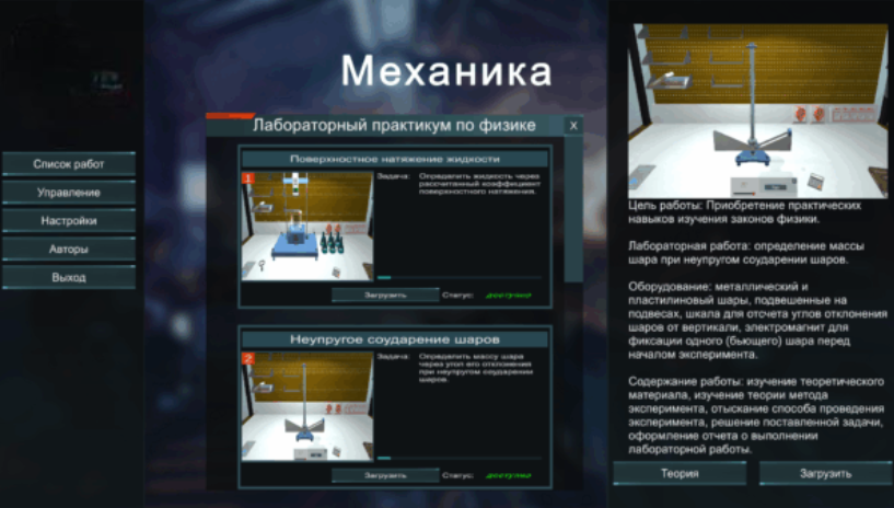 Виртуальный лабораторный практикум предназначен для изучения основных положений механики и позволяет изучить виртуальные лабораторные работы: