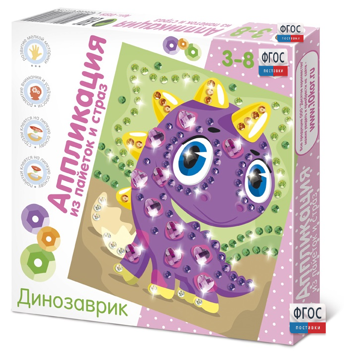 В состав каждого набора входит все необходимое для творчества: паетки разных цветов, стразы 3-х видов, картонная основа с изображением Щенка, самоклеящиеся кружочки из вспененного полимерного материала.
